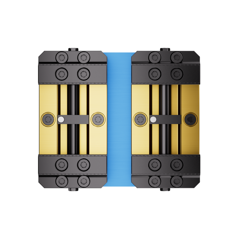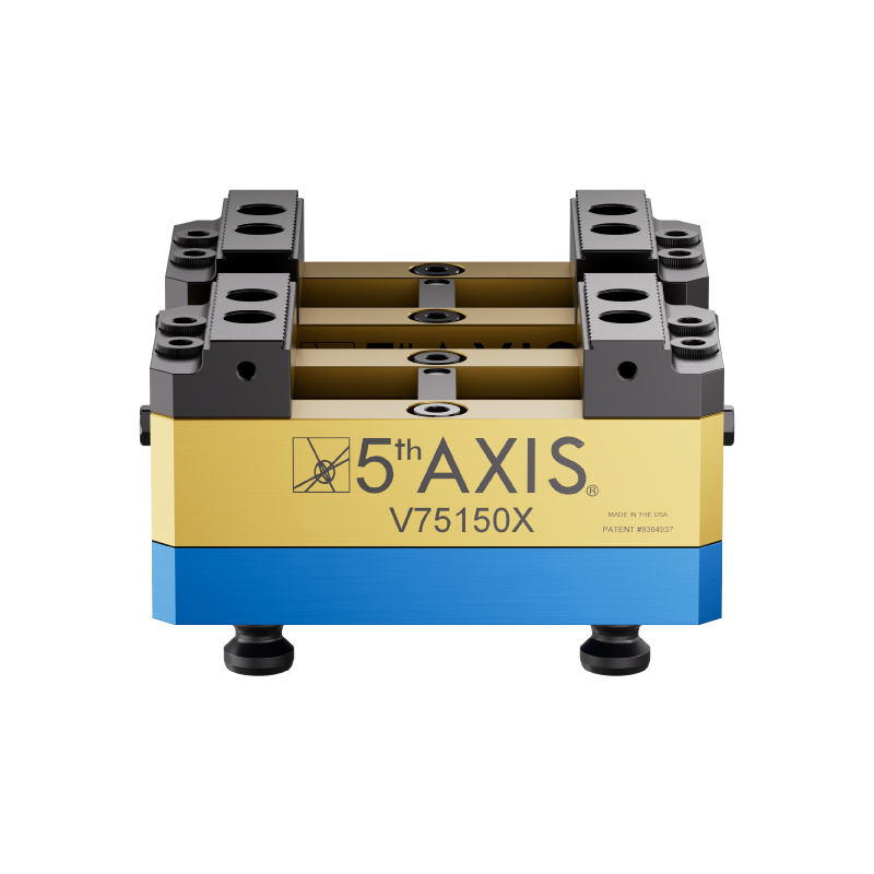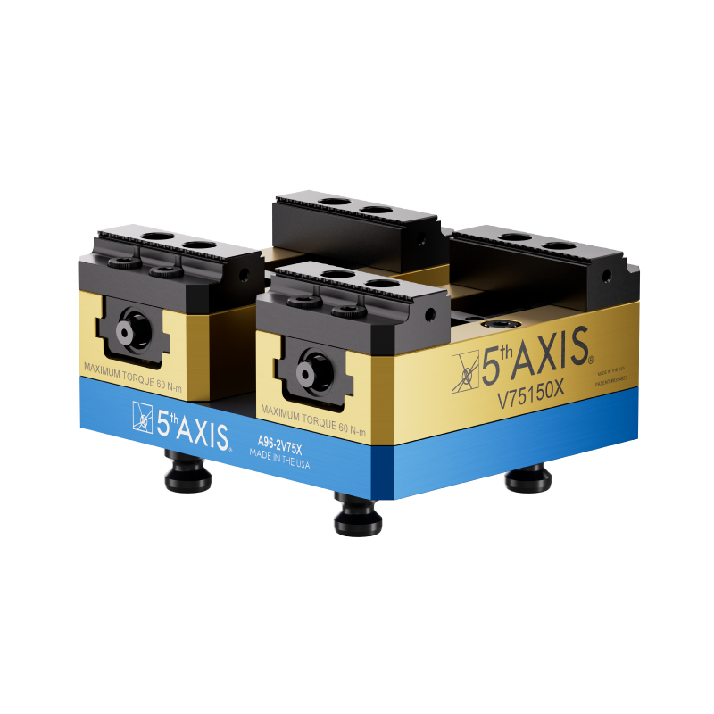 Invest in the future of machining with our 5th Axis RockLock™ 96mm Quick Change Top Tooling System. Stay competitive, boost your productivity, and achieve exceptional results in your machining operations. Trust in our commitment to quality, precision, and innovation, and take your machining capabilities to new heights today. The V75150X was created out of customer demand for a small self-centering vise with an increased clamping range over the popular V75100X vise. The base is 50mm longer than the standard V75100X, allowing the max workpiece size to increase from 76mm to 128mm. The new 4 bolt jaw mounting design reduces jaw lift and the sharper teeth provide a superior bite in raw material. This unit features 2x V75150X vises on a 96mm compatible adapter.