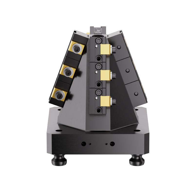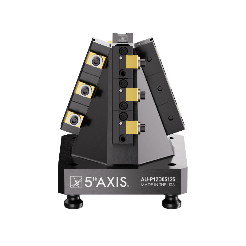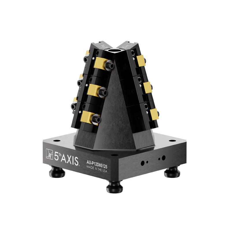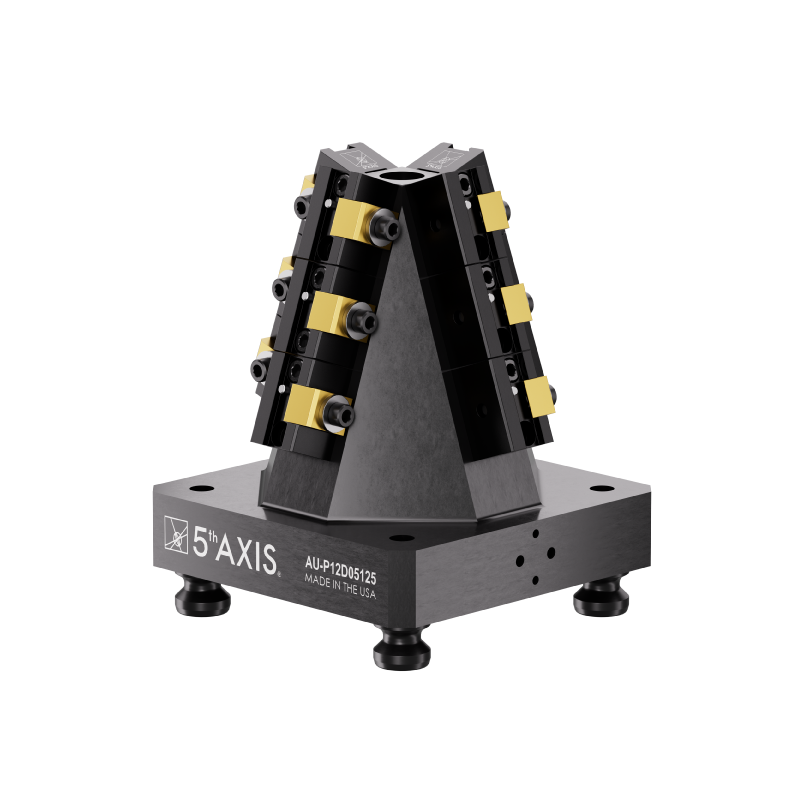 Built for our 96mm RockLock™ Quick Change System, the A96-P12D05125 provides maximum amount of flexibility. This 4 sided pyramid utilizes twelve D05125 dovetail fixtures for stock under 25mm. The orientation of the fixtures on the pyramid ensures optimal tool clearance for multiple parts. Machine up to 12 parts on this compact unit. The modular design allows for fixtures to be added or removed depending on the length of the workpiece.