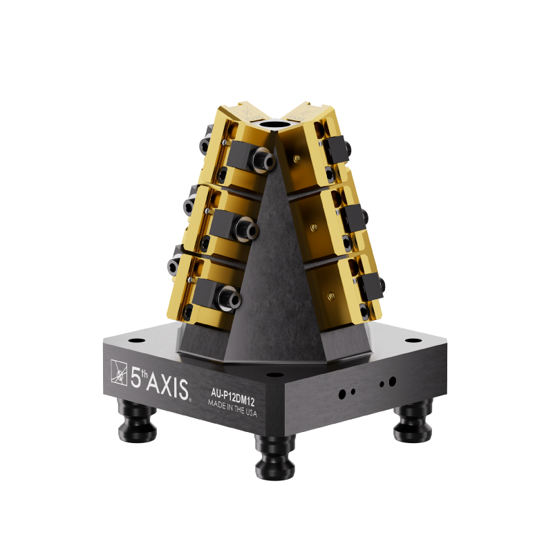 Built for the 96mm RockLock™ Quick Change System, the A96-P12DM12 provides the maximum amount of flexibility. This 4 sided pyramid utilizes twelve DM12 dovetail fixtures for stock under 25mm. The orientation of the fixtures on the pyramid ensures optimal tool clearance for multiple parts. Machine up to 12 parts on this compact unit. The modular design allows for fixtures to be added or removed depending on the length of the workpiece.